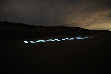 In the evening, after sunset, the word ‘Respect’ was projected onto the beach.